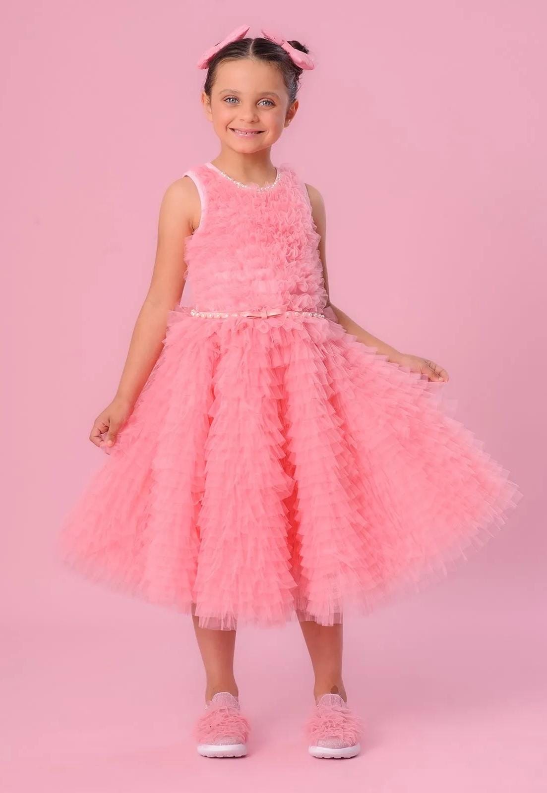 Vestido festa da Pituchinhus. Decote redondo com aplicação de pérolas e caixilhos bordados manualmente. Mangas de regata. Tule em forma de frufru no busto. Cinto com mini laço. Saia composta por camadas de tule. Perfeito para princesas modernas.
